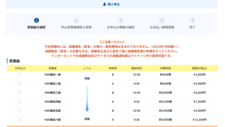 | ※申し込み方法 | ①HSK公式HPにアクセス(こちら) ②「受験する」をクリック ③右上の「マイページ」からログイン マイページのない人は登録が必要 ④受験日を選択 ⑤受験の階級と会場を選択 (※注1)以下のような画面が出てきます。 ⑥本人情報など必要な情報を入力 ⑦受験料の払い込み(クレジットやコンビニなど) |