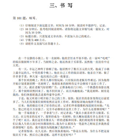 文章の要約問題です。色んな話が出てきますが、10分間読む時間がありますので、まずは全体にさっと目を通しましょう。次に、大切なキーワード(これがないと要約を書くことができない)という熟語を目に焼き付けましょう。そして、段落ごとに読んでいき、頭の中で簡単なストーリーを作っていきましょう。そして、作文ですが、作文は自分の文章力が問われます。ですので、問題文の中にあった必要な熟語を拾いながら、または言い換えながら作ったストーリーを書いていきます。できるだけ、文法、正しい用法の単語、接続詞を使いながら、簡単でも正確に書いていきましょう。難しい文章を書いてミスをするなら、簡単な文章を正確に書く方がよいです。
